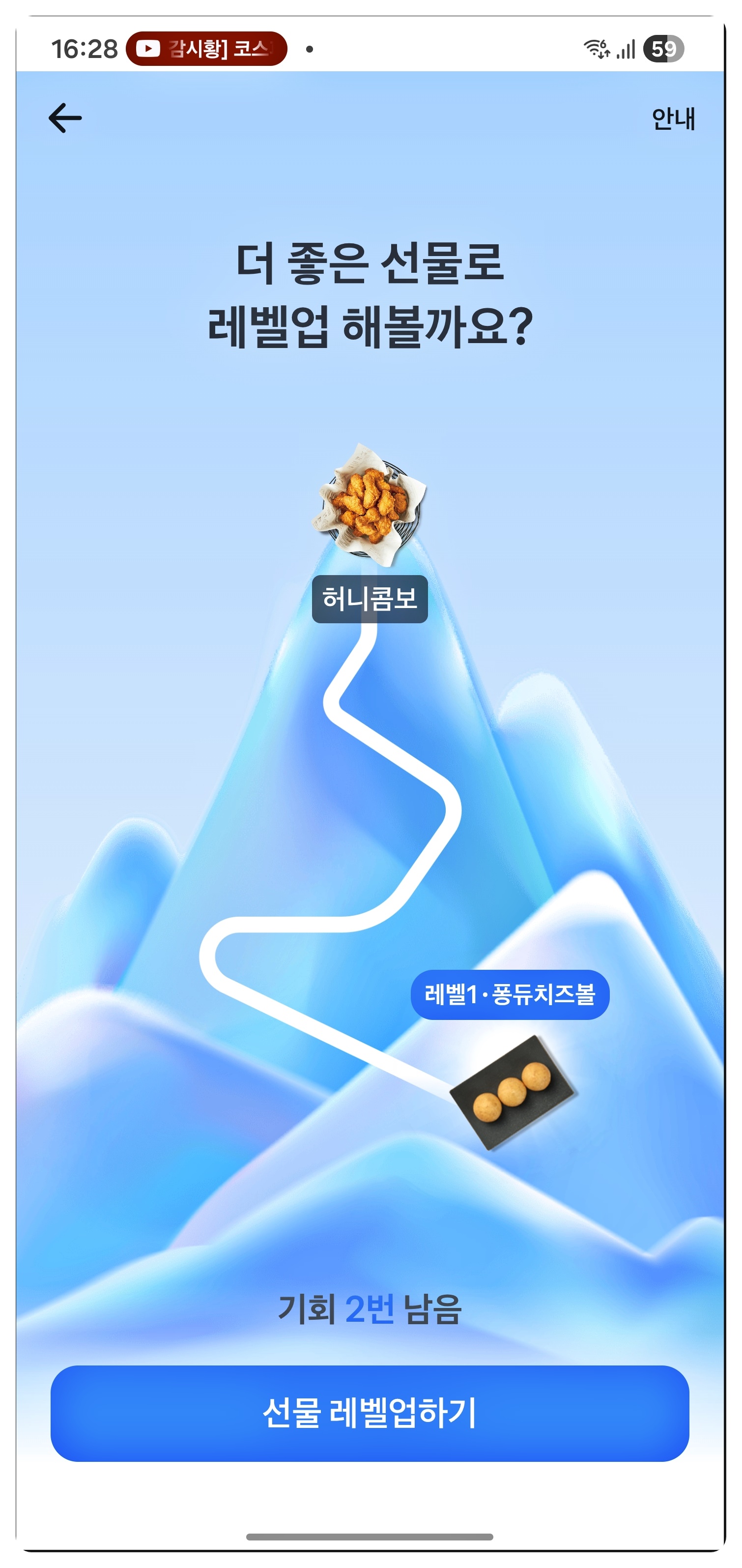 목표: 레벨을 계속 올려서 끝까지 도달하면 '교촌 허니콤보' 쿠폰 획득!