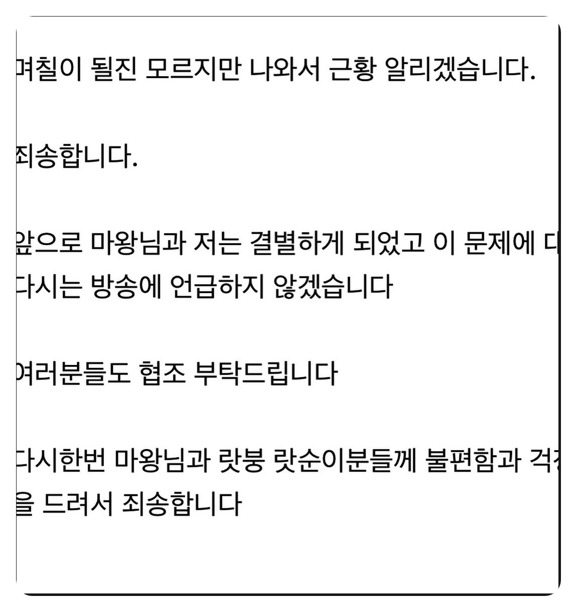 결별 선언: 그녀는 "앞으로 마왕님과 저는 결별하게 되었다"라고 공식적으로 밝혔습니다. 이어 "다시는 방송에서 이 문제를 언급하지 않겠다"며 남자친구를 향한 2차 가해를 멈춰달라고 간곡히 부탁했습니다.