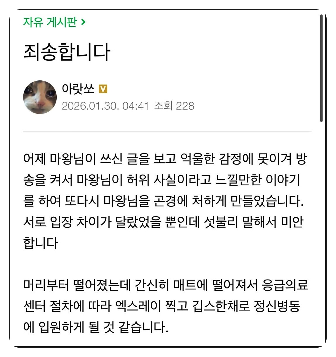 현재 상태: "머리부터 떨어졌는데 간신히 매트에 떨어져서... 엑스레이 찍고 깁스한 채로 정신병동에 입원하게 될 것 같다"라고 구체적인 부상 정도를 알렸습니다.