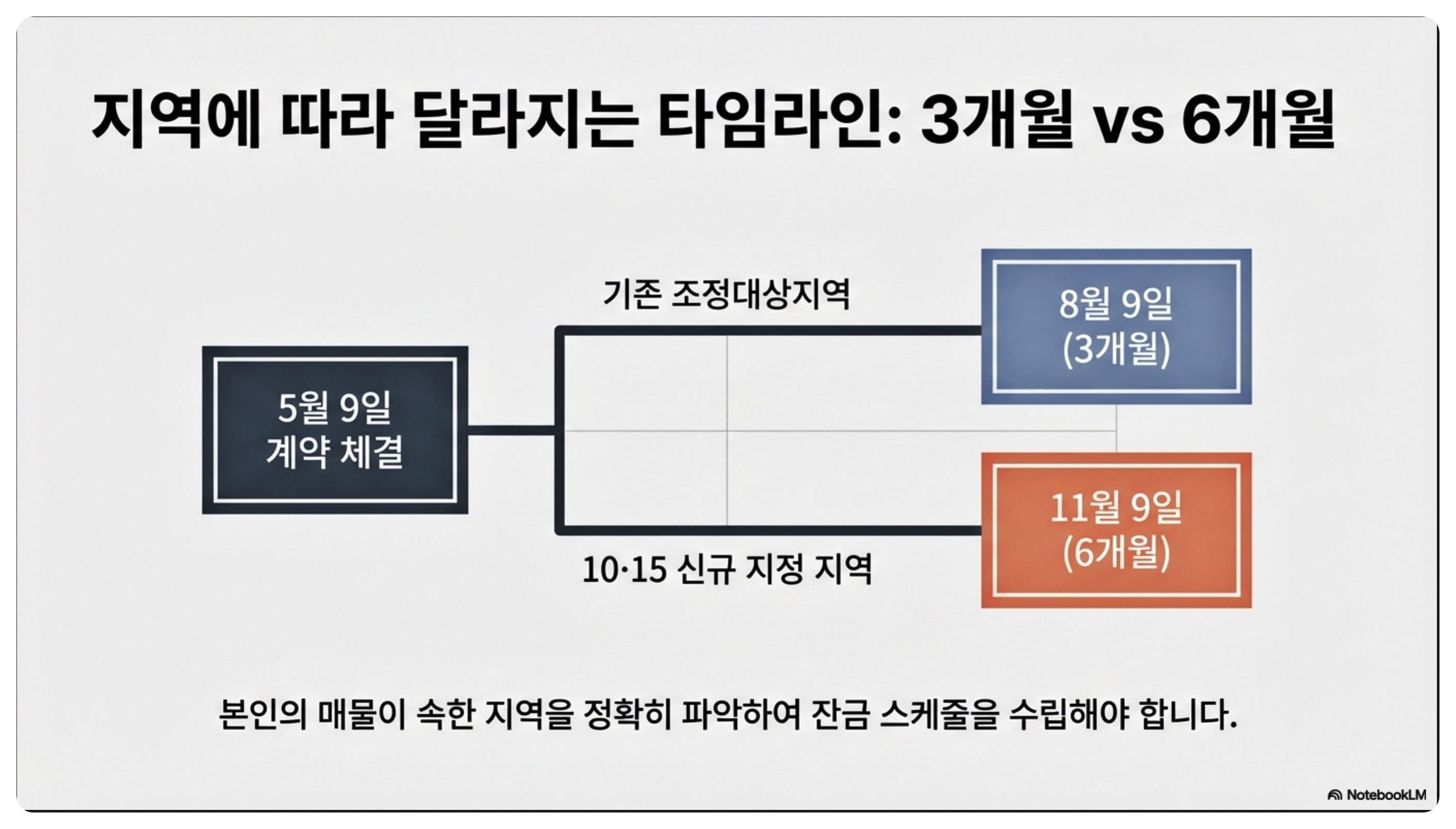 - 잔금 스케줄링: 내 지역의 유예 기간(3, 4, 6개월) 내에 잔금 및 등기가 마무리되도록 일정을 잡으십시오.