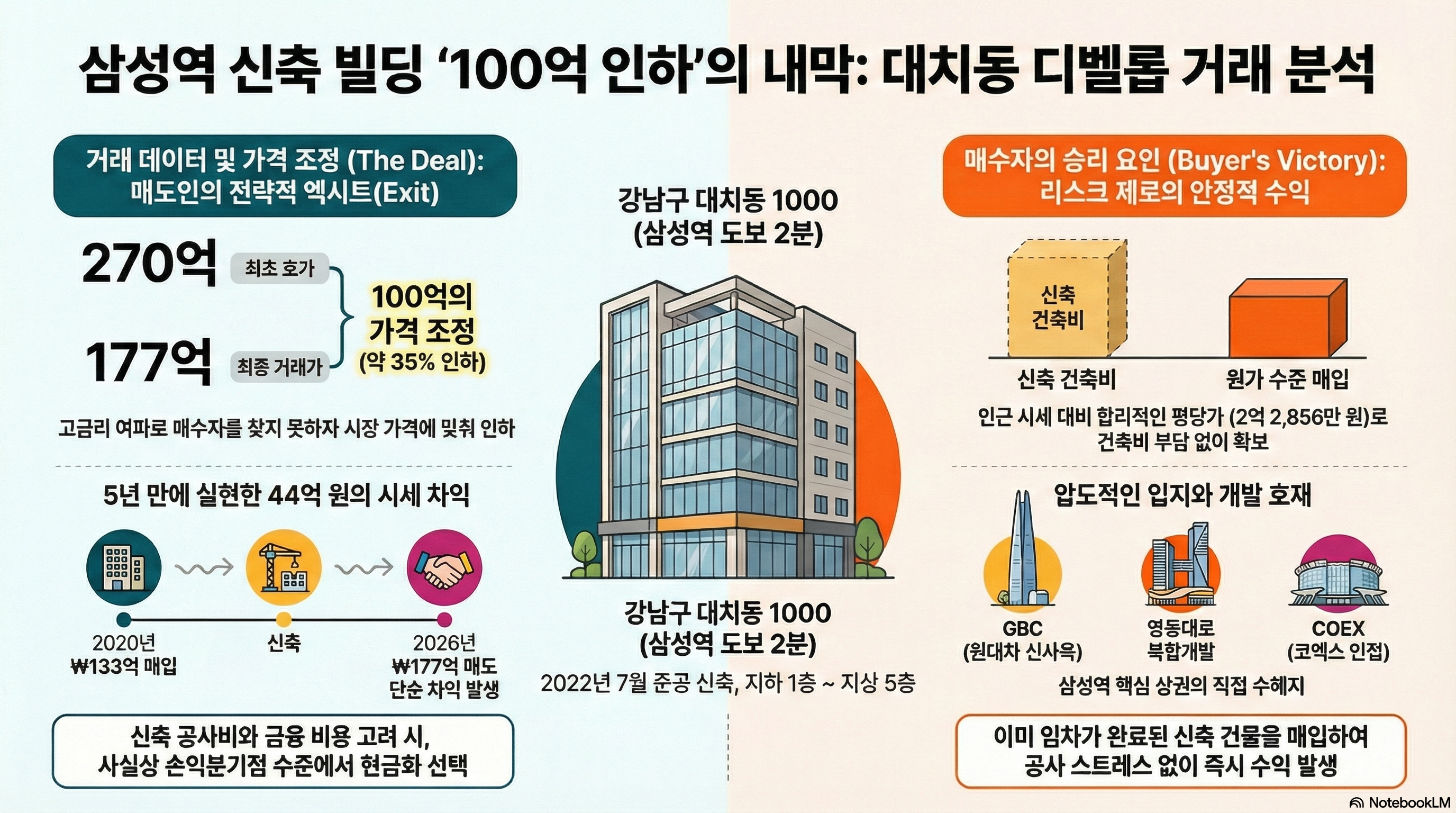 "매도인은 270억의 꿈을 177억의 현실과 바꿨고, 매수자는 삼성역의 미래를 할인가에 샀습니다. 적극적인 가격 협상이 만든 100억의 마법입니다."