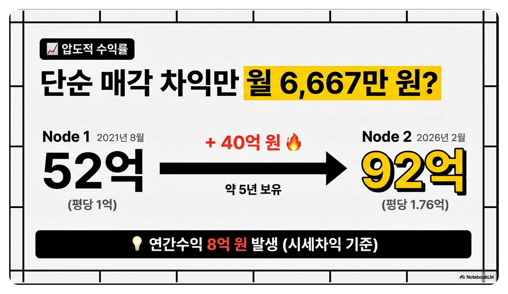 - ✅ 성공적 엑시트: 2021년 52억 원에 매입한 자산을 2026년 92억 원에 매각하며 5년 만에 약 40억 원의 시세 차익을 실현했습니다.
