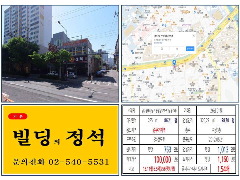 - ✅ 거래 현황: 2026년 1월, 광주 남구 방림동 대로변 3층 건물 10억 원 매매